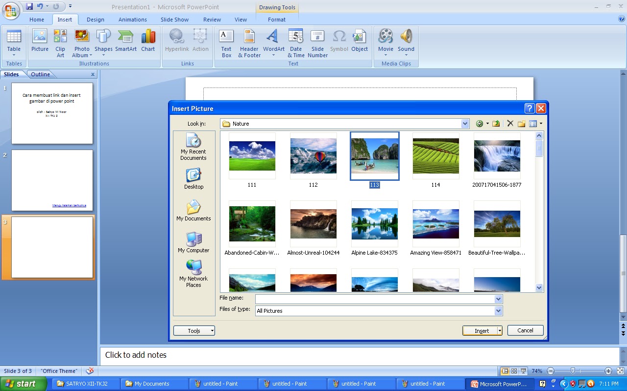 Berikut adalah cara menginsert gambar pada power point, pertama buat slide baru kemudian klik icon insert gambar, kemudian pilih gambar yang kita inginkan setelah itu klik insert untuk memasukkan.